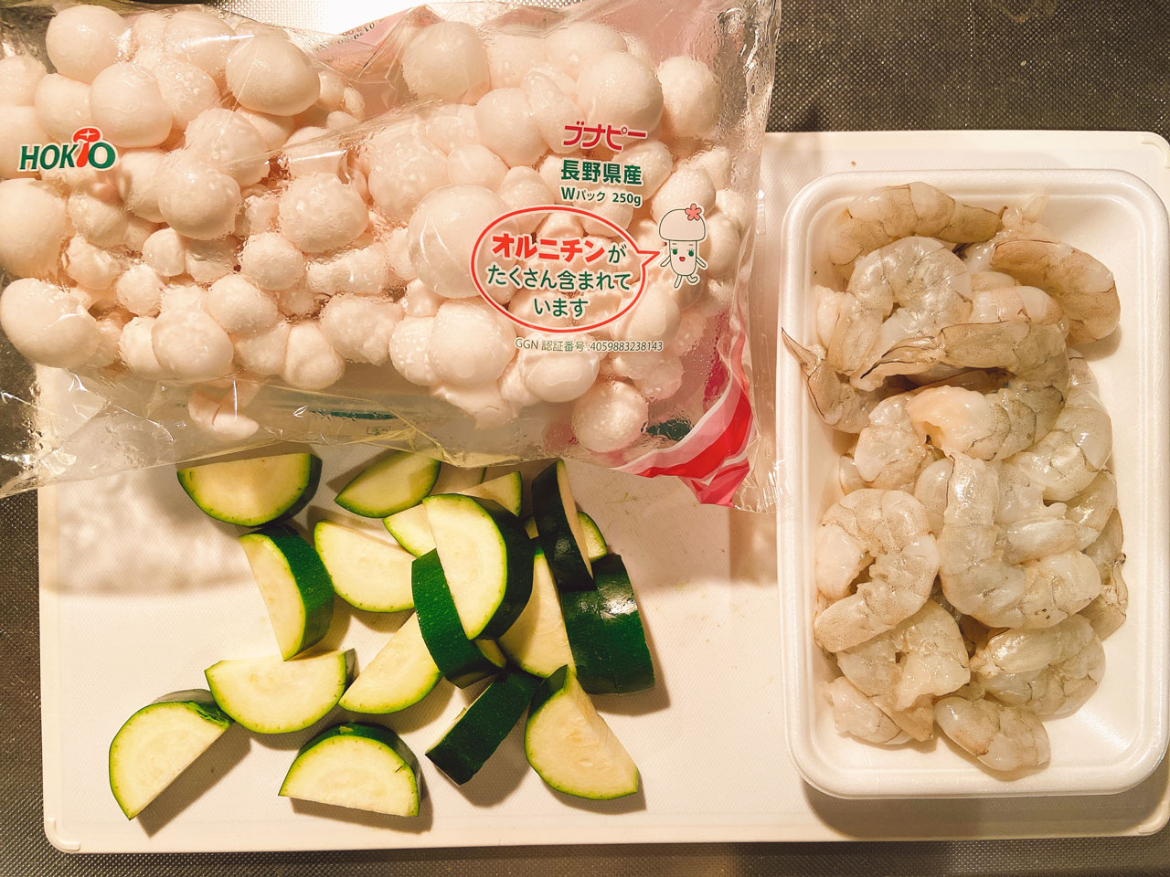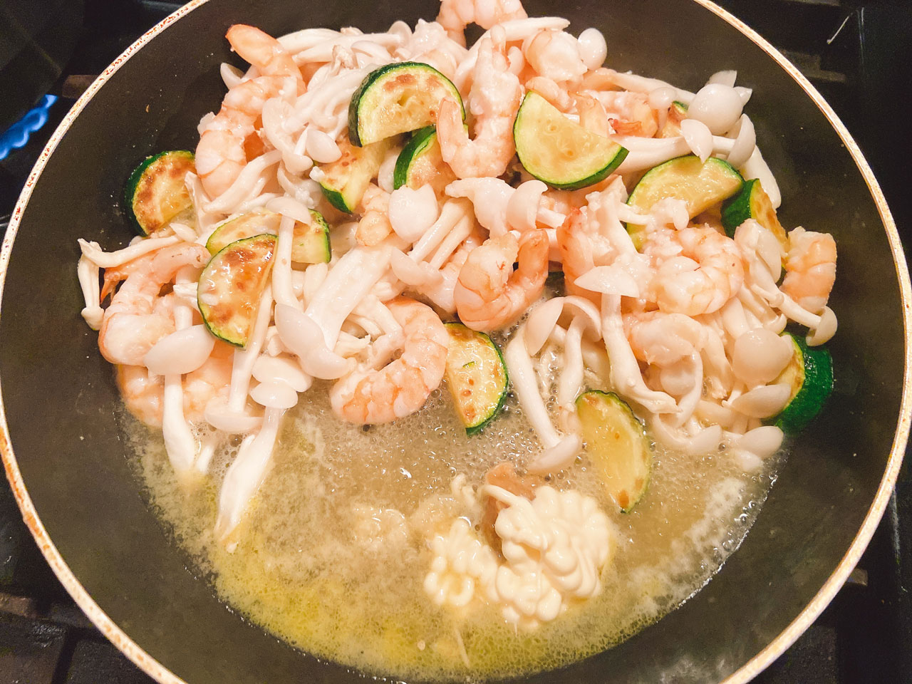 | 5 | <4>のブナピーがしんなりとしたら、<2>のズッキーニを戻し入れ、塩レモン、マヨネーズを加える。フライパンを傾けてマヨネーズを溶かし、溶けたら全体に和える。塩で味を調えたら完成。 |