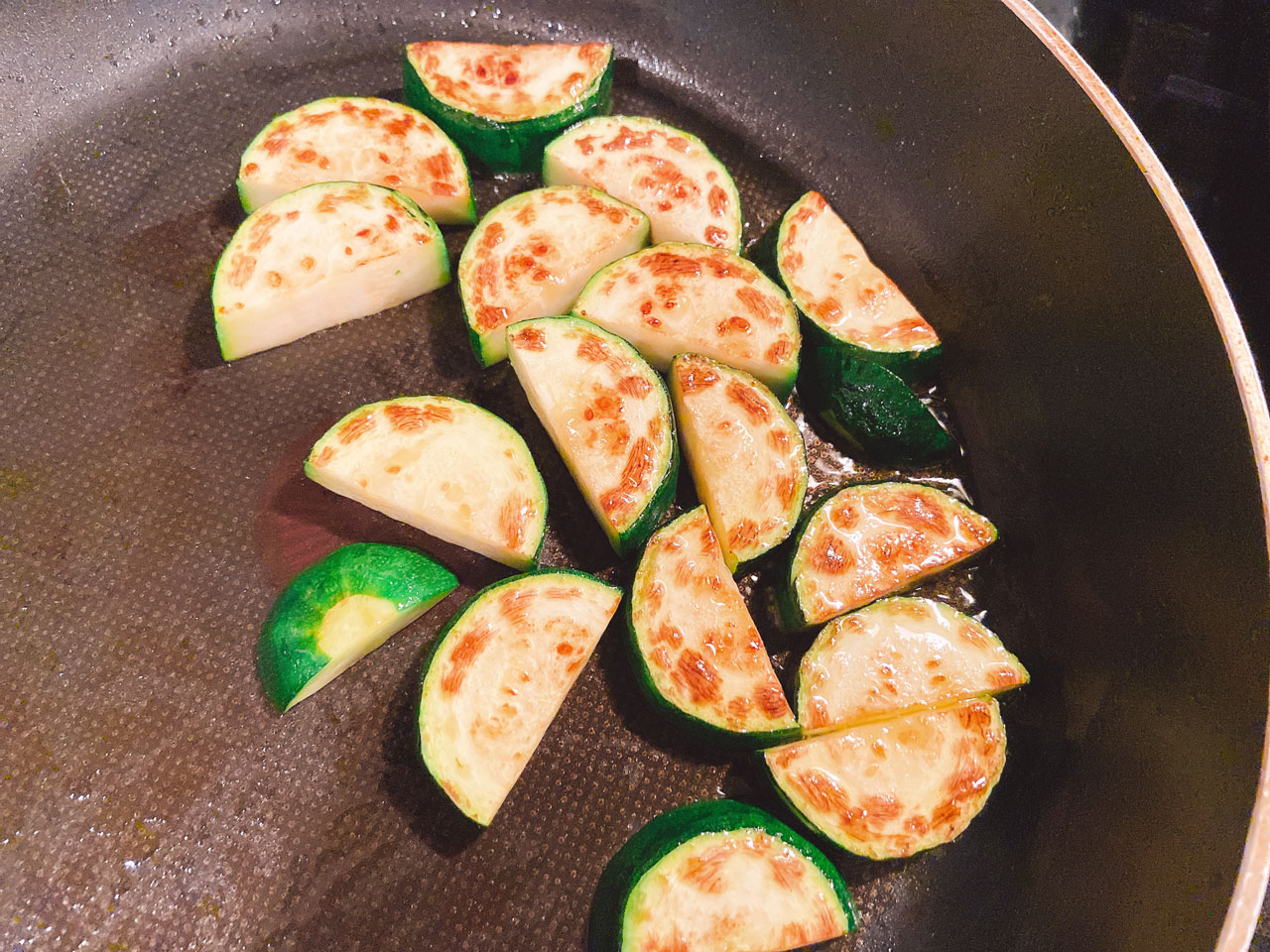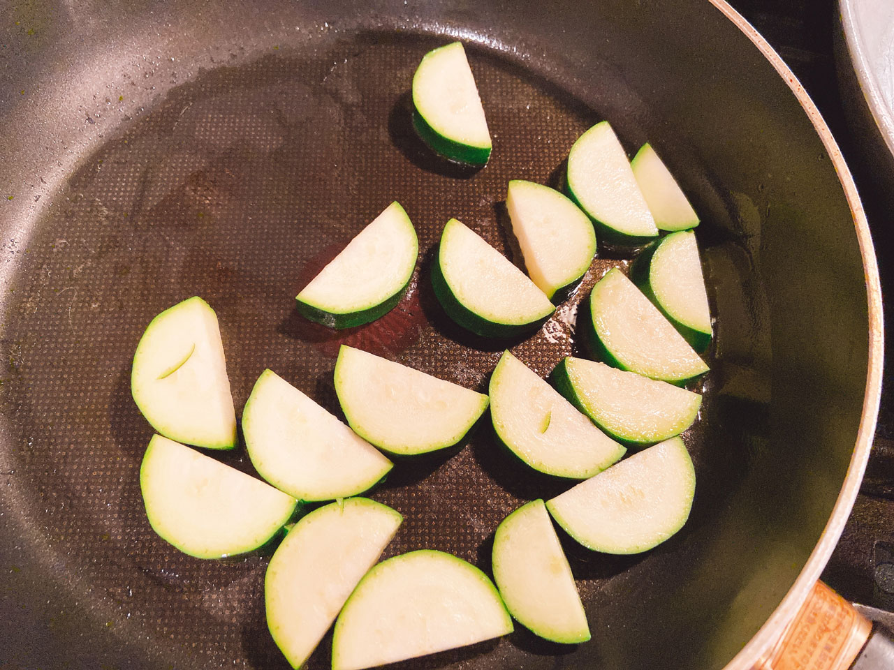 | 2 | ズッキーニ5,6mm厚の半月に切り、油を入れたフライパンで両面をこんがりと焼く。 |