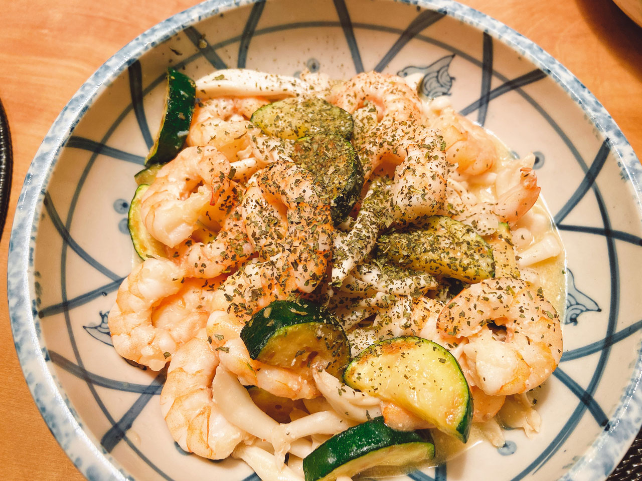 海老の旨味とプリっとした歯ごたえって、やみつきになります。そして、もうひとつの主役級がブナピー。真っ白で汚れのないその容姿とは裏腹に、強烈な旨味を隠し持っています。そんな海老とブナピーを合わせると、もう強力タッグです。