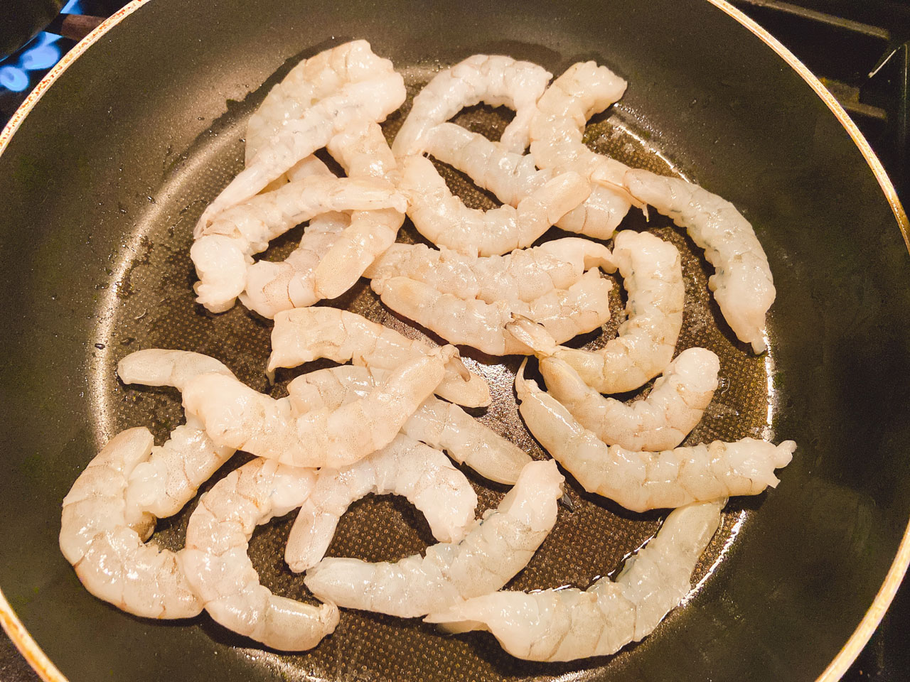 | 3 | <2>のフライパンに<1>の海老を入れて、中火で焼いて火を通す。 |