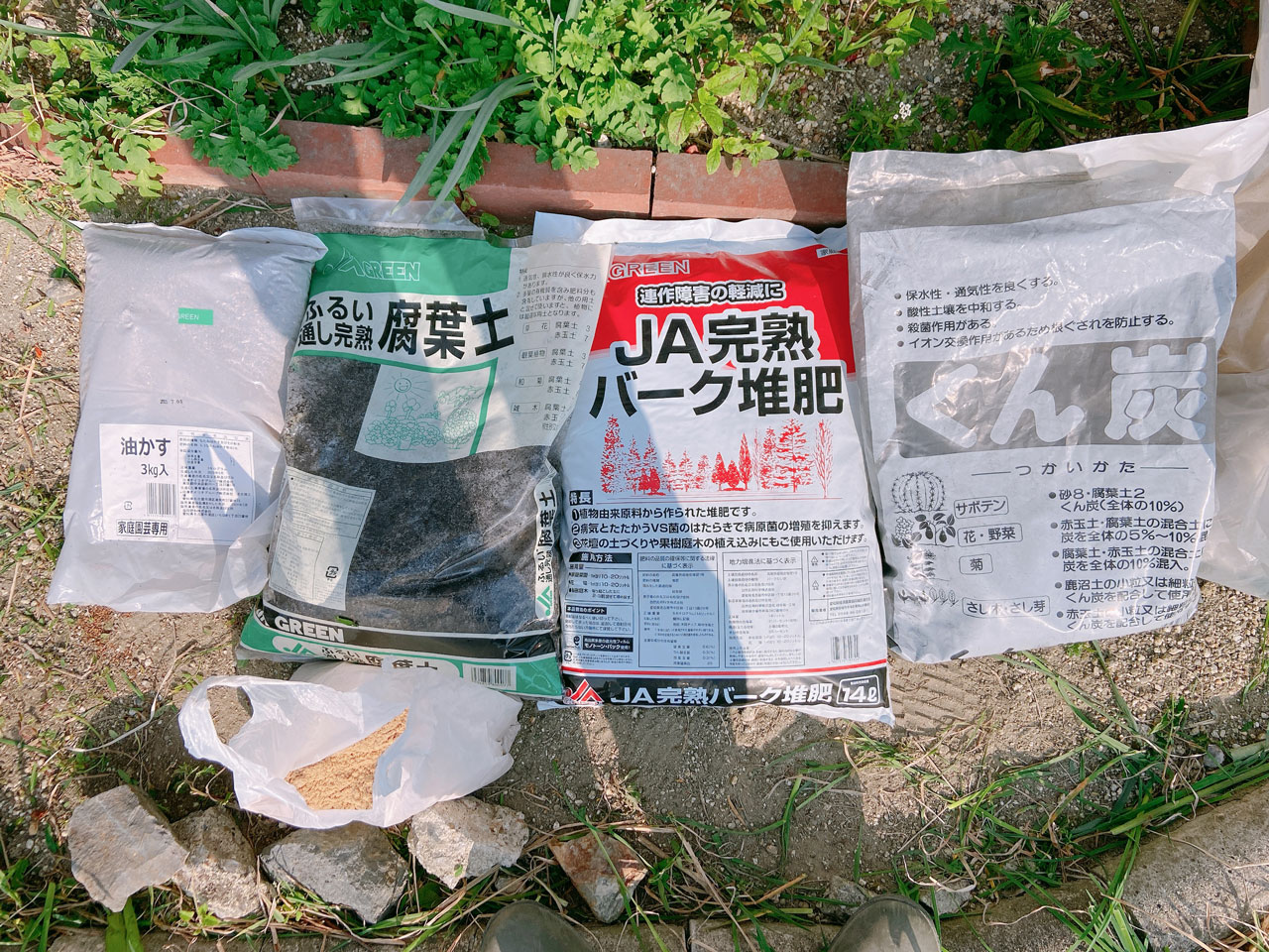 昨年までの経緯を踏まえて、今年のハタケは新たにリセットするつもりで、土への「テコ入れ」をおこなうことにしました。「テコ入れ」として施すものは、以下のものです。いずれも1㎡当たりの分量です。これは、わがやのハタケのバイブルである「1㎡からはじめる自然菜園」を参考にしました。