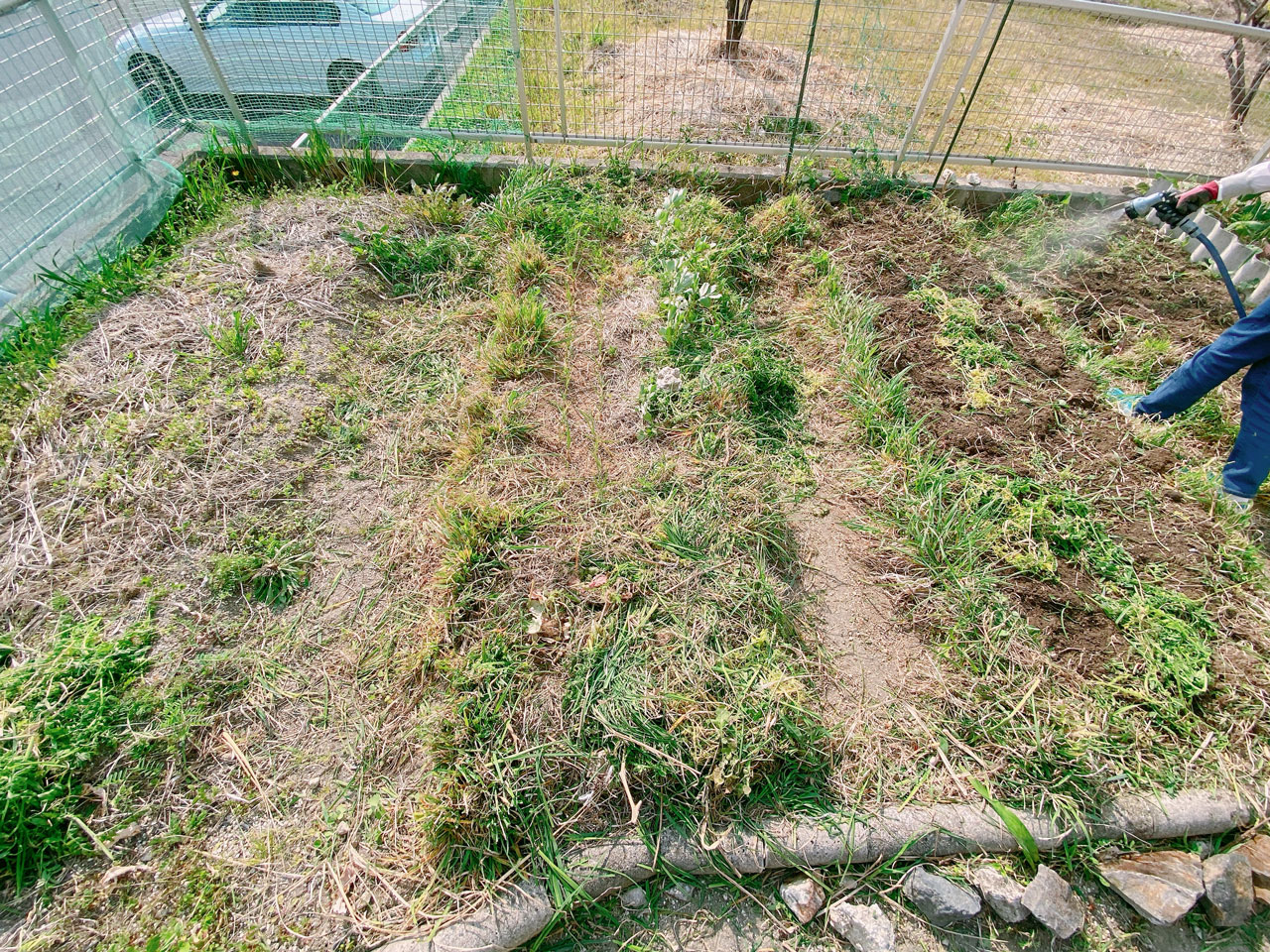まずは秋から冬の間に生えた雑草刈り。これは後からハタケに被せるのでとっておきます。そして「テコ入れ」用の堆肥などを畝の上からまいて、土にすき込んでいきます。土に一体感が出るように表面にスコップをざくざく差して、固まりをほぐします。表面を慣らし、土が乾燥しないように最初に刈った雑草を上から被せます。