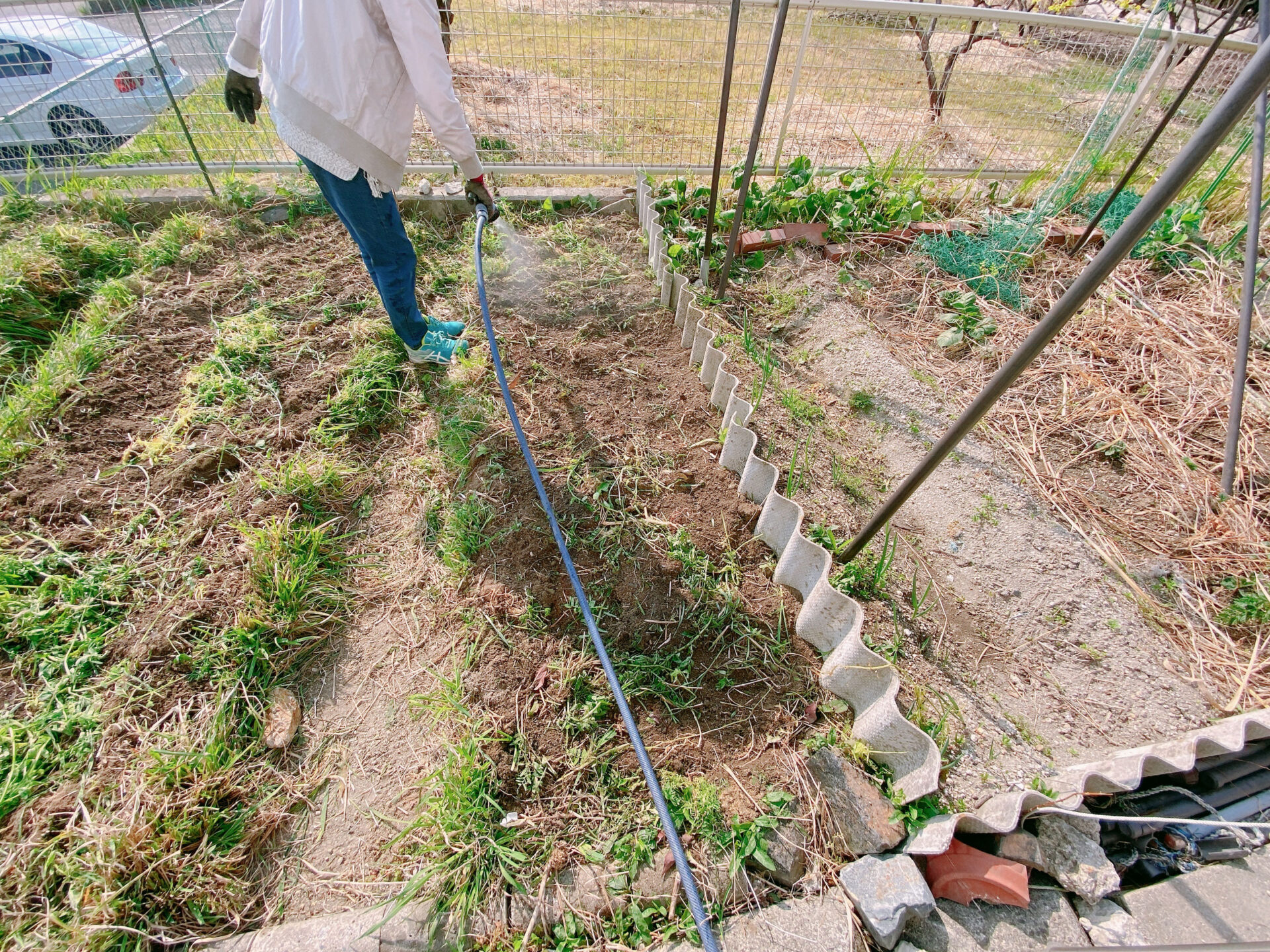 なお、ハタケAはさつま芋用の畝なので、あえて「テコ入れ」はおこないませんでした。また、同様にハタケBも現在、玉ねぎと空豆を栽培中なので「テコ入れ」はおこないませんでした。ハタケCとDのみ、今回「テコ入れ」を行いました。