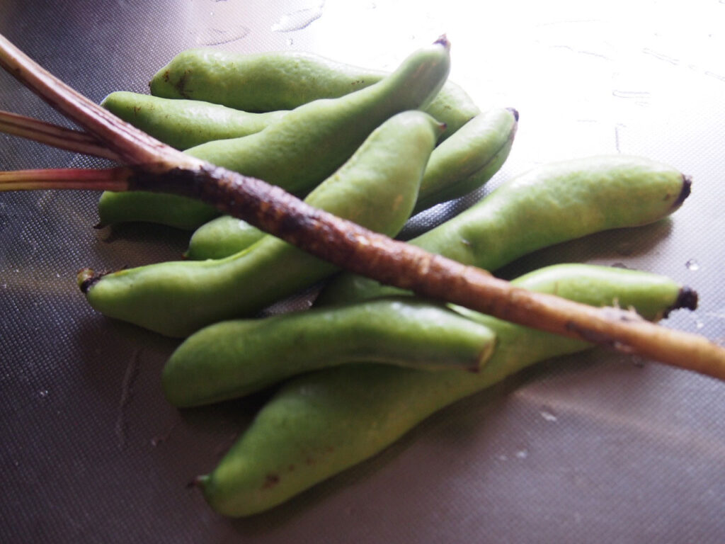 空豆収穫 2022.04.24 2022.04.23 5月のさわやかな日差しを受けて、すくすく育つ空豆。 昨秋の種まき以降、なかなか芽が出ず、うまく育つか我が子のことのように心配していましいたが、ここに来てぐんぐんと成長しています。 さて、早速採れたての空豆を使って、何か一品作りましょう。