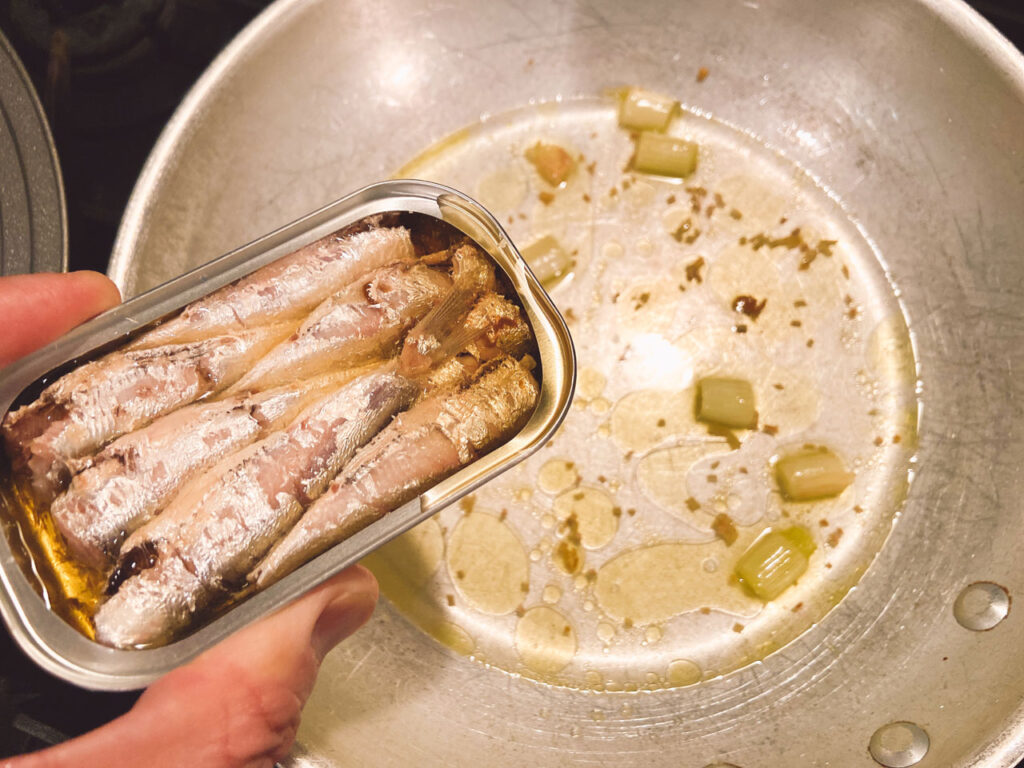 | 3 | にんにくが色付き、ねぎがしんなりとしてきたら、お酒、水適量を加え、オイルサーディンを加える。 |