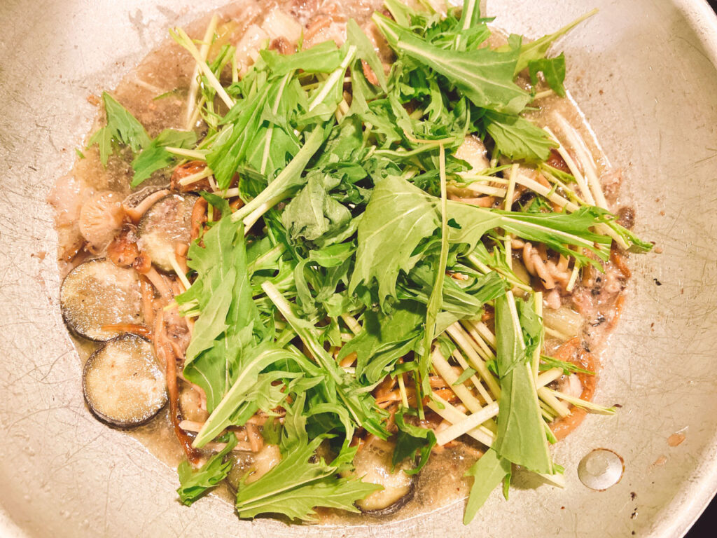 | 5 | 茄子に味が浸み込んだら、4,5cmの長さに切った水菜を加えて火を止める。 |