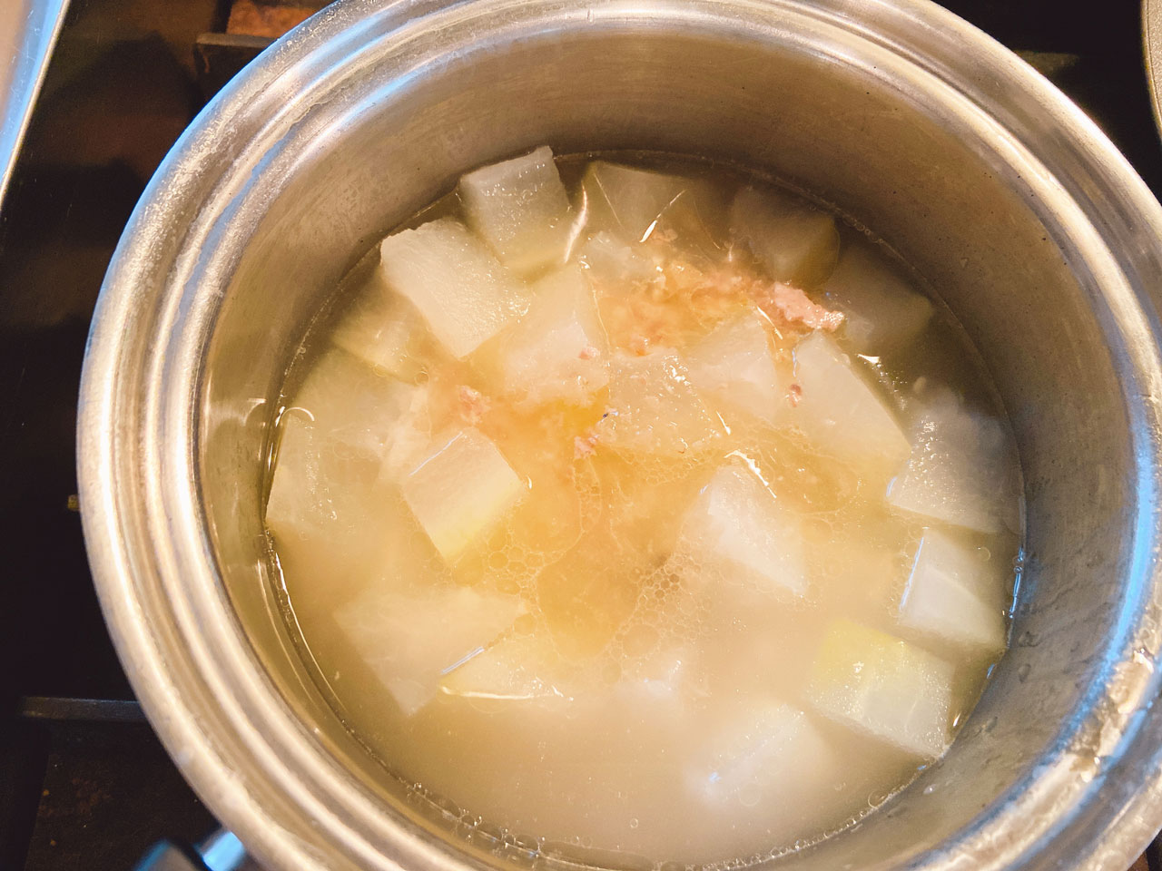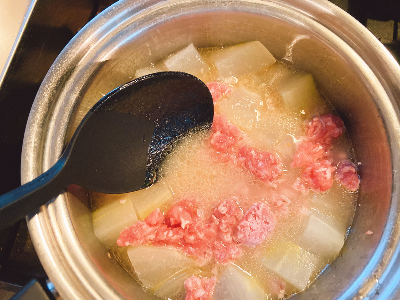 | 2 | 冬瓜が透き通ったら、豚ミンチ、オリーブオイルを加えて煮込み、塩で味を調える。豚ミンチに火が通ったら、冷蔵庫に入れるなどで冷やしておく。 |