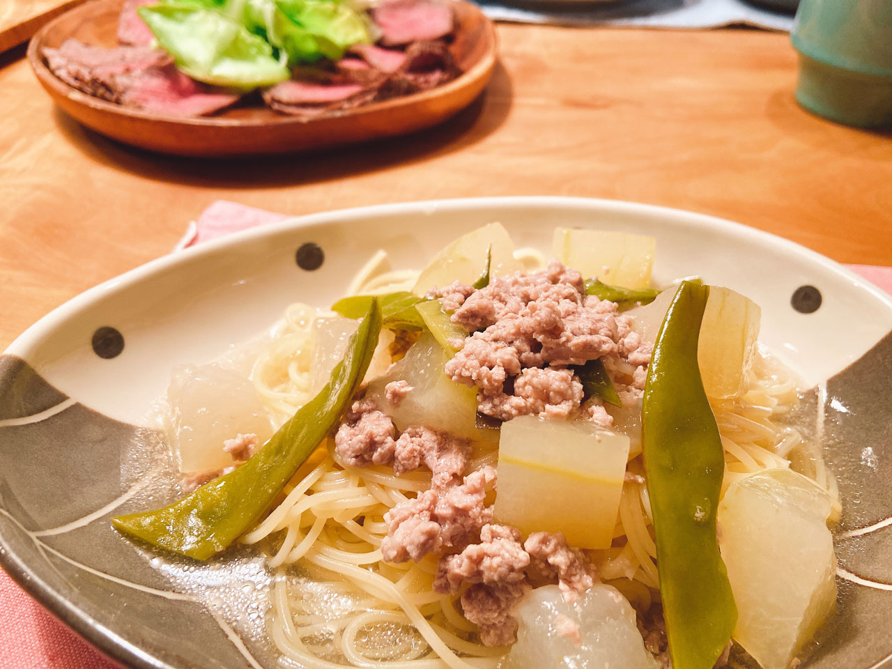 | 3 | パスタが茹で上がったら、ザルに取り、冷水で洗い、水気を切って皿に盛る。<2>の冬瓜の煮物を掛け回して完成。 |