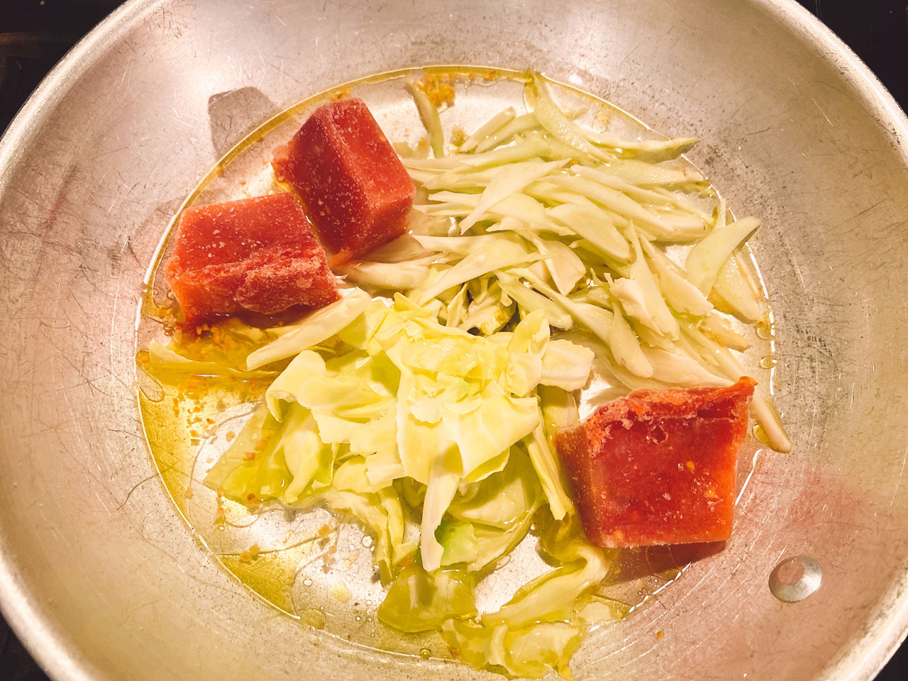 | 3 | <2>のフライパンに<1>のキャベツの茎、トマトソースを入れて煮込む。 |