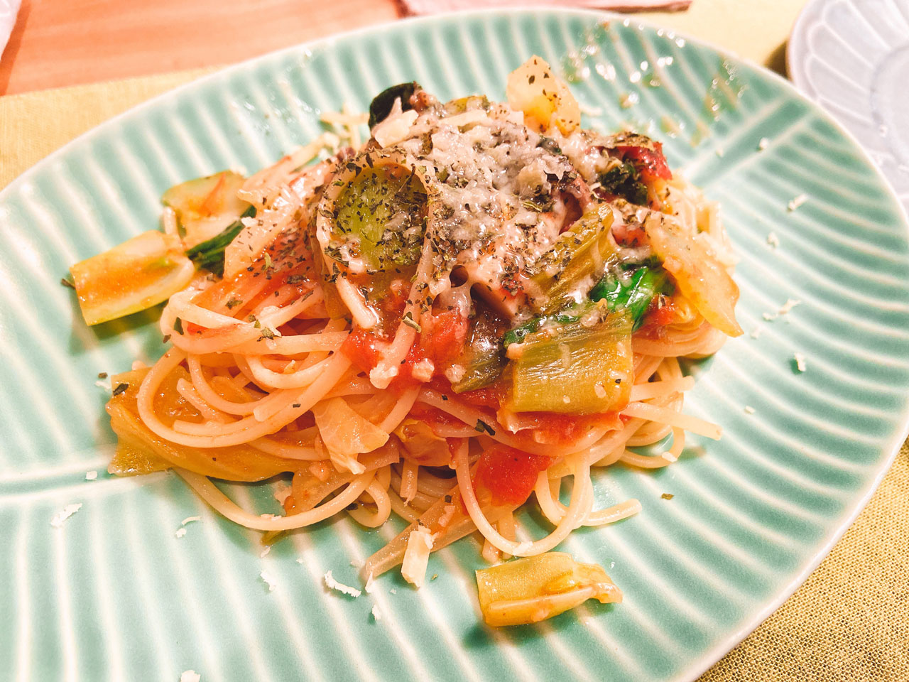 アンチョビの旨味とキャベツの甘みがマッチしたさっぱり系のトマトソースパスタです。アンチョビが入るだけで、パスタがぐっと奥深く、香り高くなってイタリアンな感じに仕上がるのがうれしいですよね。