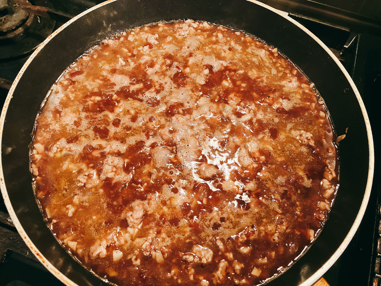 | 3 | 豚肉に火が通ったら、トマト缶と赤ワイン(ここでは赤ワイン煮込みの残ったソースを加えました)を加えて、塩を少々して煮込んでいく。 |