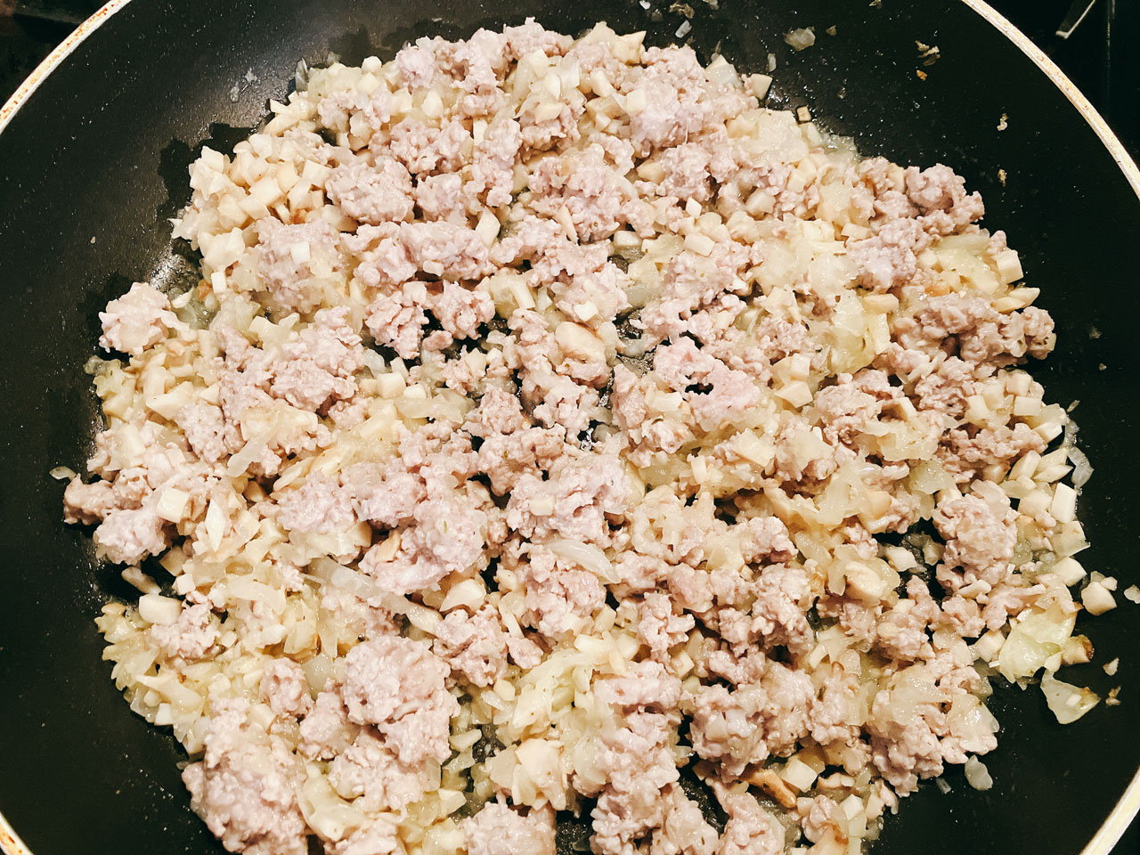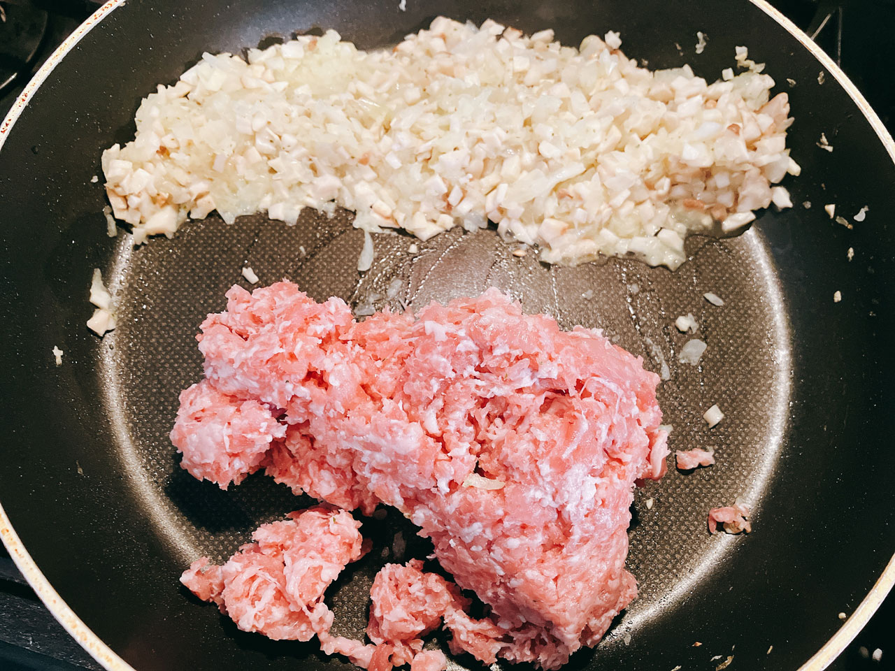 | 2 | 玉ねぎとエリンギに火が通って透き通ってきたら、ミンチ状にした豚小間肉(又は豚ひき肉)を<1>のフライパンに加え、中火で炒める。 |