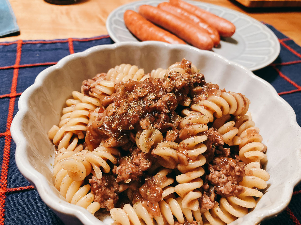 前日に作った豚肉の赤ワイン煮込みの残ったソースを加えたちょっと贅沢な濃厚ボロネーゼ。ひき肉をたっぷり使うとボリュームも満点です。煮込み料理の残ったソースって、次の日のパスタのソースに使うと、パスタがぐんとおいしくなる、上手なリメイク法ですね。