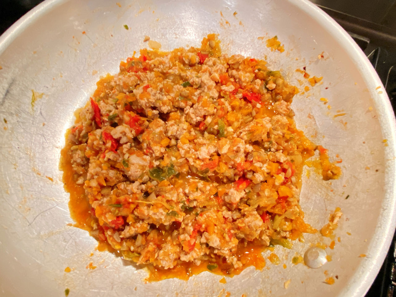 | 3 | <2>のフライパンにミンチにした豚小間肉を入れて、中火にして更に炒める。ミンチに火が通り、色が変わったらお酒、水適量を入れて、トマトソース(※)を入れて煮込む。途中で塩、こしょうをして味を調整する。 ※基本のトマトソースのレシピは後日アップ予定 |