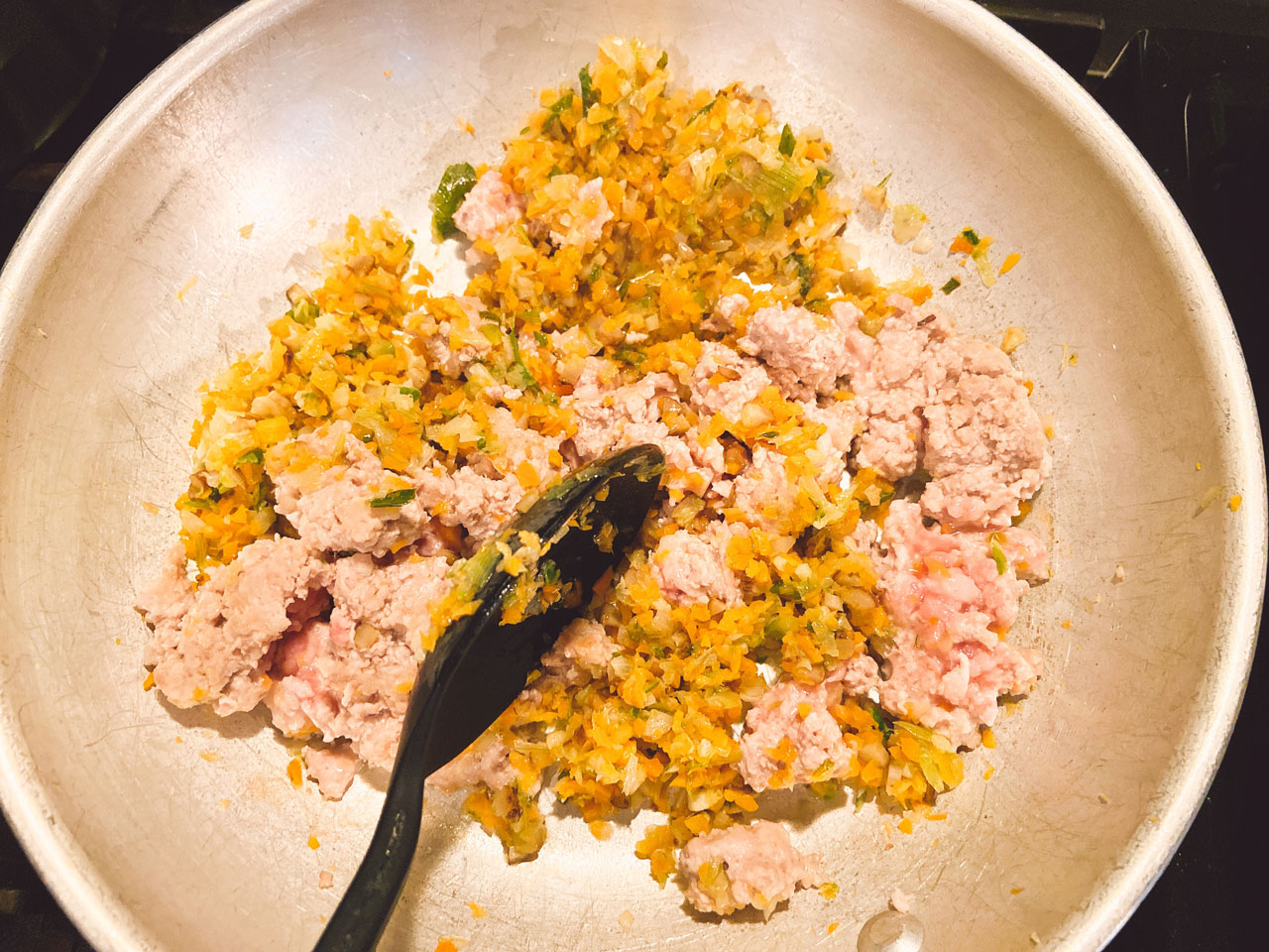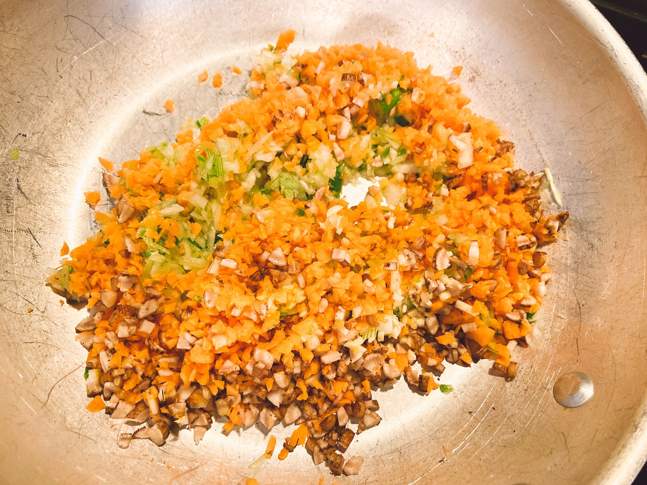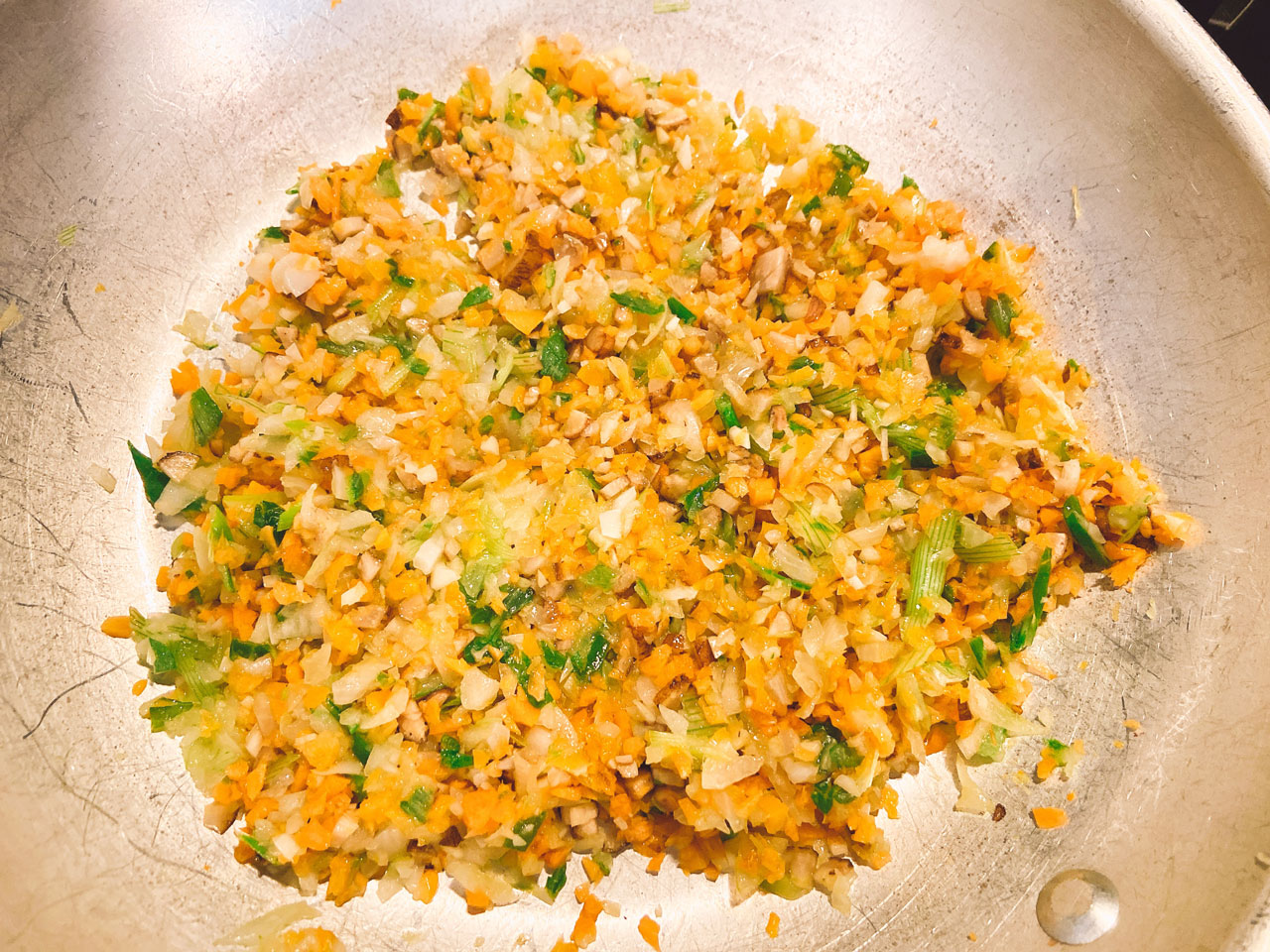 | 2 | にんにくが色付いたら、みじん切りにした玉ねぎ、人参、ごぼうを入れて、全体が茶色く色付き、しっとりとするまで更に弱火でじっくりと炒める。 |